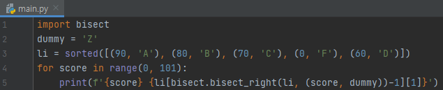 이런 식으로요. 여기에서 저는 트릭을 약간 썼는데요. 먼저 tuple은 가장 먼저 나오는 것의 대소 관계가 중요하고, 그 다음에 2번째로 나오는 원소의 대소 관계, ... 이런 식으로 우선 순위를 판단합니다. int나 str이나 비교 가능하므로, 정렬이 됩니다. 그리고 dummy를 'Z'로 두었는데요. 이는 score가 80점인 경우, 이런 경우를 경계라고 하는데요. 이 경우에, bisect_right가 (80, 'B')를 가리키는 게 아니라, (90, 'A')를 가리키게 하기 위함입니다. 1단계 위 학점을 가리키게 했으니, 실제로는 거기서 -1을 빼야 하겠죠.