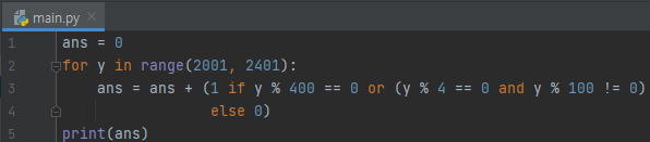 이제, 몇 개의 문제를 풀어보도록 합시다. 먼저 윤년 계산입니다. 윤년은 400의 배수이거나, 100의 배수가 아니면서 4의 배수이면 됩니다.