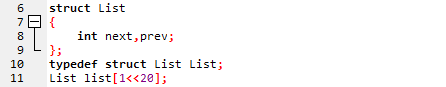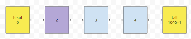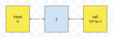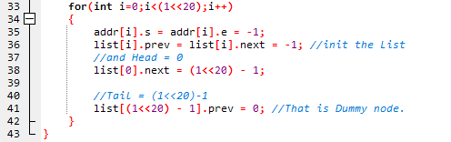 일단 Dummy는 0번하고 2^20 - 1로 설정해 놓습니다. 문제 상황에 따라 다르게 설정하셔도 무난합니다. 이들은 각각 더미 둘을 선언하기 위한 것입니다. 물론, 10^6 + 1과 같은 것을 tail로 설정하셔도 되고요. 이들 말고는 prev와 next는 모두 -1로 설정합니다. 이는 더 이상 해당 방향으로는 노드가 없다. 는 정보를 알려주기 위함이라고 생각하셔도 좋겠습니다.