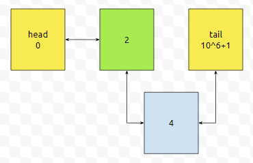 먼저, 2에 접근했습니다. 그러면 2가 List에 들어가야 할 겁니다. 다음에 4번 페이지에 접근을 했는데요. 4가 제일 최신 것입니다. 최근에 접근한 것은 tail에 가깝고, 오래 전에 접근한 것은 head에 가깝습니다. 그러면 4는 어디에 추가되어야 하나요? 2와 tail 사이에 추가되어야 합니다. 여기서, 2번은 tail의 이전 녀석입니다.