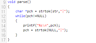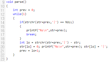 strchr 함수로, 돌리면 됩니다. 이것은 해당 위치에서부터 '|'가 나오는 최초의 위치를 리턴합니다. 그 전에 NULL 문자가 나오면, NULL을 리턴합니다. 14번째 줄이 while Loop를 빠져나오는 조건입니다. 만약에, '|'가 있다면, 해당 위치를 널 문자로 임시로 채운 다음에, str+prev를 출력합니다.