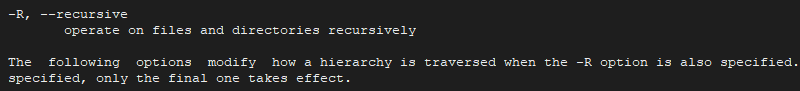 그런데 여기서 중요한 옵션 중 하나는 -R입니다. 이것은 하위 디렉토리에 적용된 파일이나 폴더들도 적용이 됩니다. recursive라는 것만 봐도 재귀적으로 동작한다는 것을 짐작할 수 있습니다.