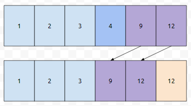 배열 [1, 2, 3, 4, 6, 12]에서 지워졌다는 maring이 3번째, 4번째에 있다고 해 보겠습니다. 이 상태에서 key 5를 추가한다고 가정해 보겠습니다. 어떻게 하면 좋을까요? 5보다 크거나 같은 최초의 위치를 연두색으로 표시해 보았습니다.