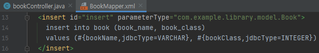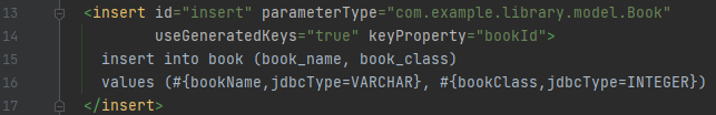 수정된 insert 문은 위와 같아요. 정리하면 useGeneratedKeys="true"로 설정해서, 자동 생성된 키 값들을 가져올 거라는 것을 명시합니다. 다음에, keyProperty로, 어떤 필드 값으로 받을지를 명시해 줍니다. bookId에 넣을 거니까, "bookId"로 넣어주었습니다. 테이블의 어느 속성들을 받을 것인지 따로 정할 수도 있는데요. 이것은 keyColumn으로 설정해 주시면 됩니다. 1개를 가져오실 때도 왠만하면 명시해 주는 게 좋을 듯 싶네요.