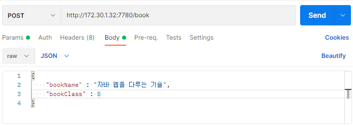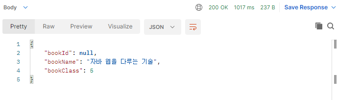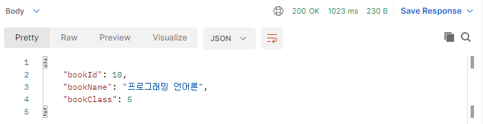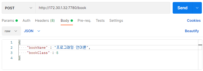 이제, POST 요청으로 책 이름은 "프로그래밍 언어론", bookClass는 5로 해서 보내 보겠습니다. json 포맷으로 보냈습니다.