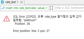 그랬더니, 에러가 떨어집니다. 왜요? 저는 "bronze", "silver", "gold"를 rate_type 열거형으로 생성했기 때문입니다. rate_type에는 "platnium"이 없었다는 것이 핵심입니다.
