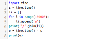 그러면, 0.023초밖에 걸리지 않음을 알 수 있습니다. 분명한 것은 동적 배열이니, 확장 연산과 같은 무거운 연산이 들어갔음에도 불구하고 print만 한 것보다는 확연히 낮은 수행시간을 보였습니다. 즉, 출력을 한번에 할 때 꽤 유용하게 쓰일 수 있습니다. append 연산을 할 때 쓰는 것도 고려해 볼 만 하고요.