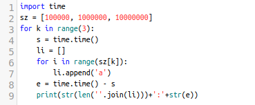 10만, 100만, 1000만번 'a'를 append 시켜 보겠습니다. 그리고 join 메서드를 이용해서 concat를 한 다음에 결과물의 len 값만 가지고 오도록 하겠습니다.