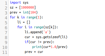 위 프로그램은 배열이 차지하고 있는 공간 크기가 바뀌었을 때에만 이전 size와 현재 size의 비율을 출력하는데요. wandbox에서 cpy 2.8과 cpy 3.8을 돌려보니 아래와 같이 나왔습니다.
