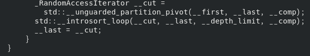 그렇지 않으면, _depth_limit를 감소시키고, __introsort_loop를 호출합니다. 일단 이 부분에 대해 먼저 이야기 해 보도록 하겠습니다. partition_pivot은, 전체 배열에서 피벗값을 뽑은 다음에, 그것을 기준으로 2분할을 하는 메서드입니다. 그런데, 그 범위가 __first부터 __last입니다.