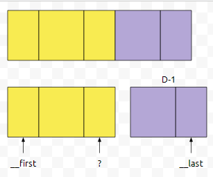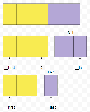 그러면, 노란 부분을 partical_sort를 할 때 depth는 D-1이 될 겁니다. ?의 값이 아마도 __last가 될 거고요. __first에서 __last까지를 표현한 것은 노란색 부분이 될 거에요. 여기서 __cut을 찾아서 분할해 봅시다.