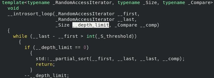 이제 LOOP 함수를 봅시다. 여기서 중요한 것은 __depth_limit가 0이 되었을 때의 동작인데요. 이 때 __partial_sort를 호출합니다.
