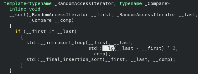 first와 last가 다른 경우, __introsort_loop를 호출합니다. 그런데, 이것은, 3번째 인자에 이상한 __lg(__last - __first)의 2배를 곱한 값을 넘긴다는 것을 알 수 있습니다. __lg(x)는 밑이 2인 log(x)의 값을 돌려주는데요. 일례로, x가 2^20이라면 20을 돌려줍니다. 만약에, __last - __first가 2^20이라면, __introsort_loop에 넘기는 3번째 인자의 값은 40이 됩니다.