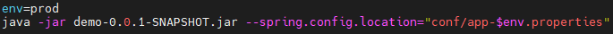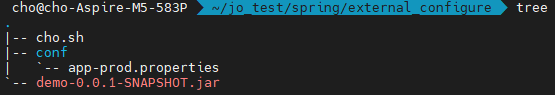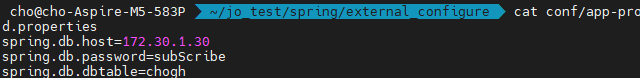 cho.sh를 보시면, java -jar 명령어가 있음을 볼 수 있어요. 그런데, 뒤에 --spring.config.location이 눈에 보이는데요. 이것의 의미는 spring.config.location의 값을 "conf/app-$env.properties"로 설정하라는 의미입니다. 그런데 $env는 env 값으로 대치 된다는 의미입니다. env 값이 prod였으니, conf 밑에 있는 app-prod.properties를 보면 되겠군요. 프로퍼티 값을 불러올 파일을 볼까요?