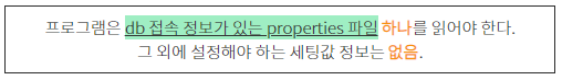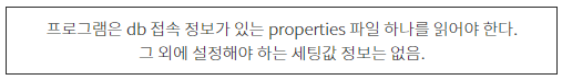 프로그램은 properties 설정 파일 하나를 읽어서, db 접속 정보를 읽어내야 합니다. 그 외에 셋팅값 정보는 없다는 것이 중요합니다. 보통 host와 password, db를 읽어야 합니다. 이 3개가 있어야 접속을 할 수 있기 때문입니다. 단지, 접속 정보를 외부 파일로부터 읽어내는 것이 중요한데요. 외부 파일은 아래 위치에 있다고 해 봅시다.