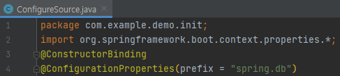 ConfigureSource도 사실 별 게 없습니다. ConstructorBinding도 별 게 없습니다. 단지, 생성자에서 처리하게끔 했을 뿐이고요. 4번째 줄에 있는 ConfigurationProperties의 prefix를 "spring.db"로 설정했을 뿐입니다.