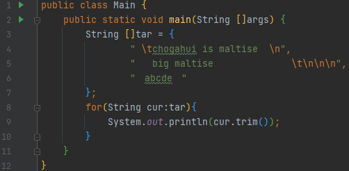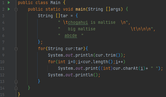 테스트 데이터를 만들어 보겠습니다. 3개의 String이 들어가 있는데요. 위에 2개는 white space가 공백과 new line, tab으로만 이루어져 있어요. 문제는 3번째 string인데요. 겉 보기에는 왼쪽에도 공백, 오른쪽에도 공백이 있는 거 같습니다.