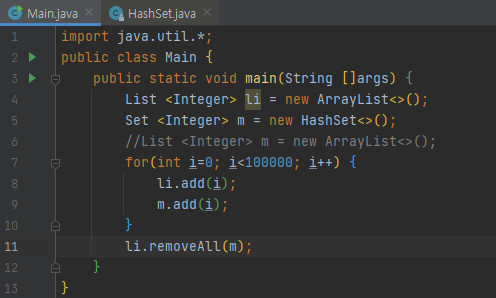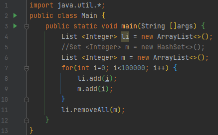 list에 0부터 99999까지 추가합니다. 다음에, list m에도 0부터 99999까지 추가합니다. 다음에 removeAll 메서드를 호출하였습니다.