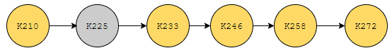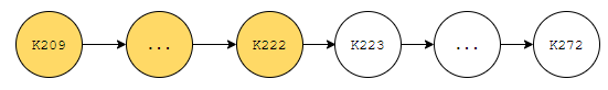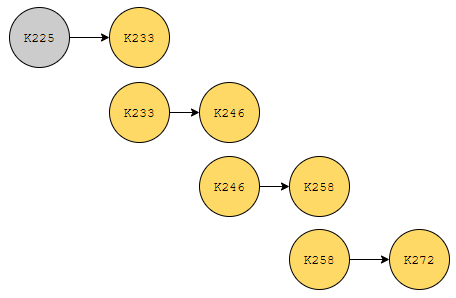 예를 들어 ~역이 K258이고 ~역이 K272라면. 이 구문이 있습니다. '예를 들어' 라던지, for example 이런 것은 언어 계열 문제들을 풀 때 도움이 되는지 개인적으로 잘 모르겠습니다만, 코딩 테스트에서는 결정적인 힌트가 될 수 있습니다. 이 정보를 통해서 어떻게 도식화를 시킬 수 있는지 봅시다. K258, K259, ... , K272 순서로 멈추게 된다. 이러한 구문이 있어요. 그러면 일단, 아래와 같이 도식화를 시킬 수 있어요.