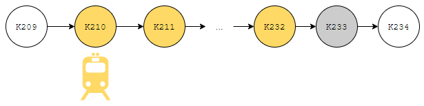 그러니 이 부분까지 반영하면 위와 같이 표현할 수 있습니다. 이제 이것을 K225부터 K272까지 가희가 타고 갈 구간으로 치환해 봅시다. 그러면, 아래와 같이 그릴 수 있습니다.