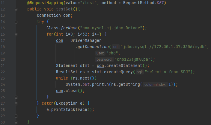 이제, GET /test api를 작성해 보겠습니다. 이것은, 제가 구축한 mysql server에 접속해서, mydb 데이터베이스에 있는 SPJ 테이블에 있는 내용들을 모두 긁어옵니다. 그런데, 17번째 줄을 보면, Connection을 얻어왔는데, 커넥션을 닫는 것이 없습니다. GET /test를 계속 호출해 봅시다. status를 보면 어떤 값이 계속 변하는지 알 수 있을 겁니다.