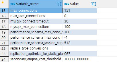 이 중에 max_connections가 보이는데요. 이 값은 문서에 따르면, 허용하는 클라이언트 연결 수의 최댓값을 의미합니다. 그리고 이 문서를 보면, 실제로 mysqld가 허용하는 컨넥션은 max_connections + 1임을 알 수 있어요. 151 + 1 = 152니까, 152개의 커넥션까지는 허용한다는 의미가 됩니다.