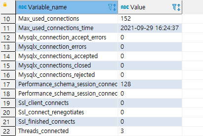 아까와는 다르게 Threads_connected가 150까지 치솟지 않음을 알 수 있습니다.