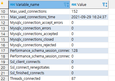 이 중에 Threads_connected를 보는 게 좋겠군요. 문서에 따르면, 오픈된 connections 수라고 되어 있기 때문입니다.