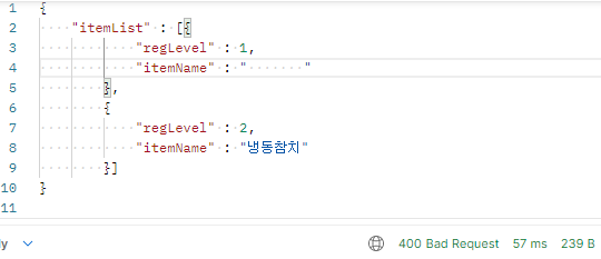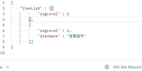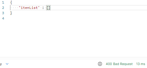 itemList가 빈 경우는 어떨까요? 400을 떨굽니다. 왜냐하면, itemList가 1 이상이여야 한다는 조건을 걸어놓았기 때문입니다.