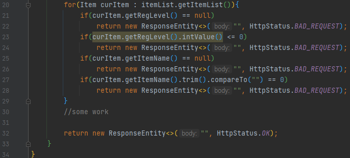 아이템 리스트가 있다면, RegLevel이 null이거나 0이면 또 400을 떨어트리고, itemName이 null이거나, 공백으로만 이루어져 있으면 400을 떨어트립니다. 아. 미처 몰랐는데, itemList가 비어 있는 경우 400을 떨어트리는 로직은 까먹고 적지 않았네요. 사실, 21번째 logic부터 28번째 logic은 Item 클래스에 checkValid하는 메서드를 넣어서 단순화 시킬 수도 있기는 하지만 뭔가 복잡해 보입니다.