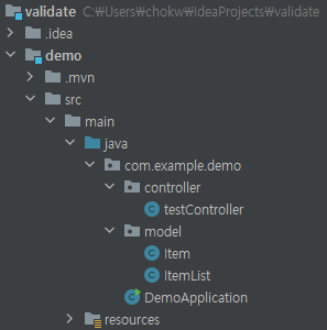 대략적인 프로젝트 구조는 위와 같습니다. model에는 Item과 ItemList가 있습니다. GET /item api는 item들의 List들을 json으로 받게 되는데요. List로 받는 item들은 비어 있으면 안 되고, 각각의 아이템은 reqLevel이 1 이상이여야 하고, item 이름이 공백으로만 이루어져 있거나 비어 있으면 안 된다고 해 보겠습니다.