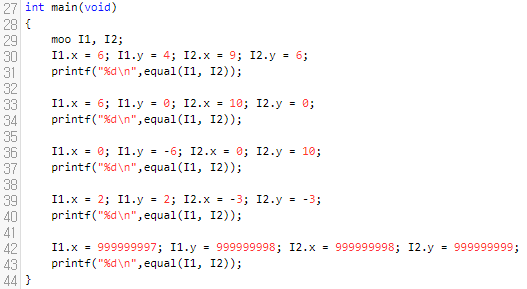 그러면 어떻게 해야 할까요? 이 문제의 의도는 매우 간단합니다. 실수 오차에 대한 개념을 알고 벡터의 기본 연산인 정수배, 실수배 연산을 응용할 수 있는가였습니다. (1, 2)와 (2, 4)가 원점으로부터 같은 방향을 보고 있다는 거를 판단하기 위해서. 데이터 (2, 4)를 잘 봅시다. 2와 4의 최대 공약수인 2로 나누면 (1, 2)가 됩니다. (-1, -2)와 (-2, -4)는 어떨까요? -2와 -4의 절댓값은 각각 2와 4입니다. 2와 4의 최대 공약수는 2입니다. 따라서 -2를 2로 나누고 -4를 2로 나누면 (-1, -2)가 되는데 이것은 (-1, -2)와 같습니다. 로직을 보겠습니다.