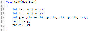 중요한 건 이 부분입니다. tar에는 풍선이나 거너의 공격 방향이 들어 있는데요. 16 ~ 17번째 줄을 보면, tar.x와 tar.y의 절댓값을 가지고 와서 이들의 최대 공약수를 18번째 줄에서 구하고 있어요. 다음에, 원래 들어온 공격 방향의 x값과 y값을 각각 g로 나누는데요. 이는 벡터에서 k배를 해 봤자 크기만 바뀌지 방향이 바뀌지는 않기 때문입니다.