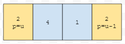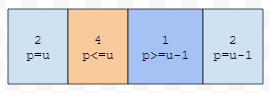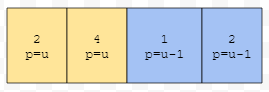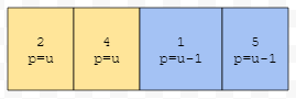 이제 4와 1이 실행되었을 당시 우선 순위를 채워야 하는데요. 만약에 2가 처음에 실행되었을 당시에 4의 우선순위가 u보다 컸다면 2보다 4가 먼저 실행되었을 겁니다. 그런데 2가 먼저 나왔으니, 2가 처음에 실행되었을 당시, 4의 priority는 u보다는 작거나 같습니다. 다음에 1이 실행되었는데요. 1의 priority가 u-1보다 작았다면, 2, 4가 실행되고 나서 1이 올라가지 않았을 겁니다. 그러니, 위 그림과 같이 그려질 건데요.