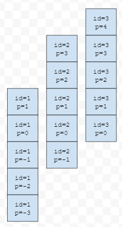 우선 순위가 같은 모든 프로세스들을 id 순서대로 쭉 실행시키는 것을 1 사이클이라 보기로 했어요. 그러면, 상황을 아래와 같이 도식화를 시킬 수 있습니다. 실행 시간이 모두 5인 id가 1이고 우선 순위가 1인 프로세스, id가 2이고 우선 순위가 3인 프로세스, id가 3이고 우선 순위가 4인 프로세스가 있다 해 봅시다.