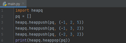 그래서, 처음에 (1, 2)와 (-1, 3)을 heapq에 넣고 빼면, (-1, 3)이 먼저 나오게 됩니다.