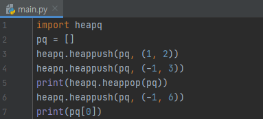 먼저 2번째 줄은 prioroity queue 역할을 할 배열을 선언한 거에요. 다음에 heappush를 하는데요. pq에 tuple (1, 2)를 넣습니다. 4번째 줄에는 (-1, 3)을 넣어요. 다음에, 5번째 줄에서, pq에서 맨 위에 있는 원소를 pop 하면서 맨 위에 있었던 원소를 가져오게 됩니다. 그리고 다시 (-1, 6)을 heap에 넣고, 7번째 줄에서 pq[0]에 무엇이 들어있는지만 봅니다. heappop하고 pq[0]하고 뭐가 다를까요?