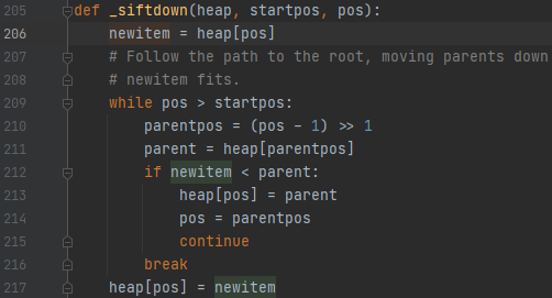 여기서 newitem은 맨 뒤에 있는 (-1, 2)를 의미해요. while loop를 따라가 봅시다. 먼저 pos인 1이 startpos인 0보다 크므로, while 루프를 타게 되는데요.