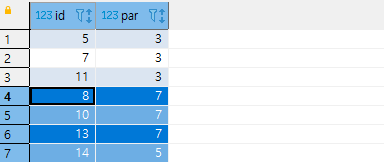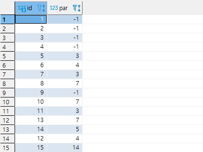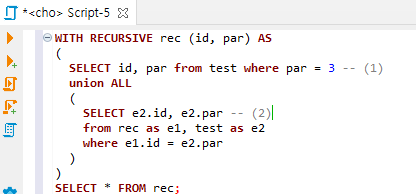 먼저, test 테이블에는 id와 par가 저장되어 있어요. par가 -1인 경우에는 부모가 없다는 뜻이고요. par가 -1이 아닌 0보다 큰 정수라면, 부모가 있다는 뜻입니다. 예를 들어, id가 6인 노드의 부모는 4임을 의미합니다. 이 데이터는 포레스트 형식을 만족해요. 우리는 3의 자식과 자식의 자식들, ... 을 모두 출력할 건데요. 문서에서 with recursive가 어떻게 동작하는지 설명이 상세하게 나와 있어요. 이를 참고해서 작성을 한 쿼리는 아래에 있습니다.
