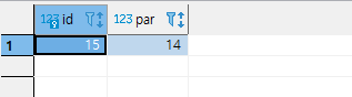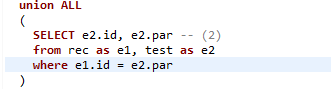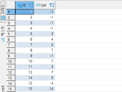 rec가 row set (2)를 의미합니다. row set (2)의 id는 15만 있었습니다. rec과 test를 카티션 곱 할 텐데 이 중에 e1.id = e2.par이려면, e2.par가 15여야 합니다. 그런데, 그런 데이터는 없습니다.
