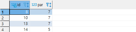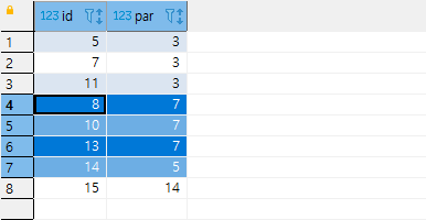 1번째로 뽑힌 row set의 id가 8, 10, 13, 14였고, 이것이 e1이였습니다. e2.par는 test에서 뽑아올 겁니다. 그러면 test에서 par가 8이거나 10이거나 13이거나 14인 것만 뽑혀올 겁니다.