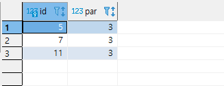 뭔가 어려워 보이지만, (1)이라고 주석을 친 쿼리 문과 (2)라고 주석을 친 쿼리문을 보면서 천천히 이해해 봅시다. 먼저, 3의 자식들을 출력하기 위해서는, test라는 테이블에서 par가 3인 것들만 찾아주면 됩니다.