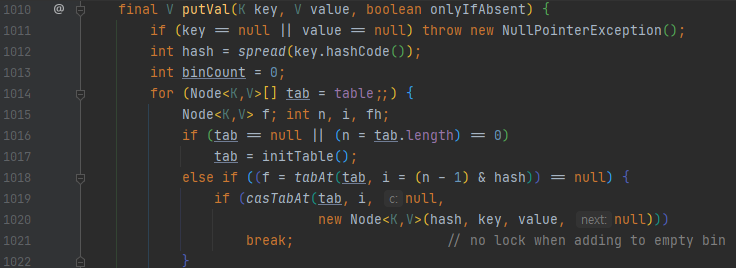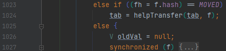 그리고 밑에 else 절을 보면 synchronized(f)가 있는데요. 이를 통해서 f를 기준으로 lock을 건다는 것을 알 수 있어요. 여기서 f는 버킷 하나를 의미합니다. 락이 걸리는 단위가 맵 전체에서 버킷 단위로 줄어들었습니다. 테이블이 초기화 된 상태입니다. expand가 되지 않고 단지 버킷에 키 하나만 추가되는 상황이라면 어떤가요?