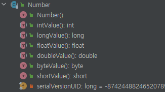 이 클래스 안에는, intValue, longValue, floatValue, doubleValue, byteValue, shortValue 메소드가 있어요. 이들이 boxing 되어 있는 value를 type conversion하기 위한 것이다. 나름 합리적인 추론일 겁니다.