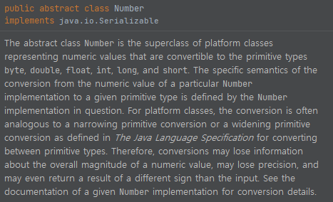 설명을 봐도 유추할 수 있는데요. super class인데, 플랫폼 클래스들의 슈퍼 클래스라 되어 있어요. 그런데 이 클래스들은 numeric value들을 representing할 수 있는 것들입니다. 그리고 이 numeric value들은 원시 타입으로 바뀔 수 있는 값들입니다. 원시 타입으로 바뀔 수 있는 친구들을 표현하는 플랫폼 클래스들의 부모 클래스다. 정도로 해석하시면 됩니다.