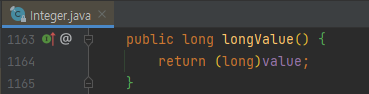 Integer 클래스의 longValue는 어떨까요? 별 다를 바는 없습니다. 포장된 int value를 long 형으로 강제 형변환을 시켜 버립니다. 쉽게 말하자면, 포장된 numeric value를 int, long과 같은 primitive type으로 (conversion 하는 방식에 따라 변환해서) 떨어트리게 됩니다.