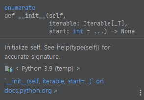 enumerate가 내부적으로 n과 element 쌍을 yield 하게 됩니다. 따라서, start가 없다면 인덱스와 iterable한 무언가에 있는 원소를 가져올 겁니다. 위 프로그램은, list에 있는 아이템과, 인덱스를 가지고 옵니다.