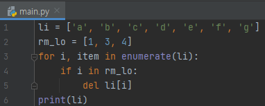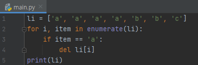 저는 list에서 'a'를 모두 제거하고 싶습니다. 그래서, enumerate로 싹 다 돌면서 item이 'a'인 경우 li[i]를 제거합니다. 잘 동작할 거 같지만, 결과를 보면 그렇지 않음을 알 수 있습니다.