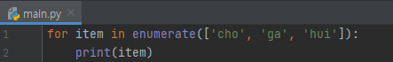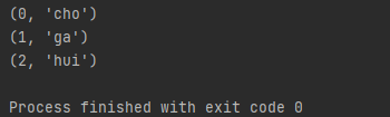 어? 순회해서 값을 가져올 때 마다 앞에 index가 붙음을 알 수 있어요. (0, 'cho'), (1, 'ga'), (2, 'hui')가 순서대로 나왔네요. start 값을 주면 어떻게 될까요?