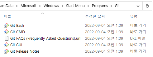 해당 경로로 들어가 보시면, 폴더 여러개와 git-bash, git-cmd 등이 있음을 볼 수 있습니다.